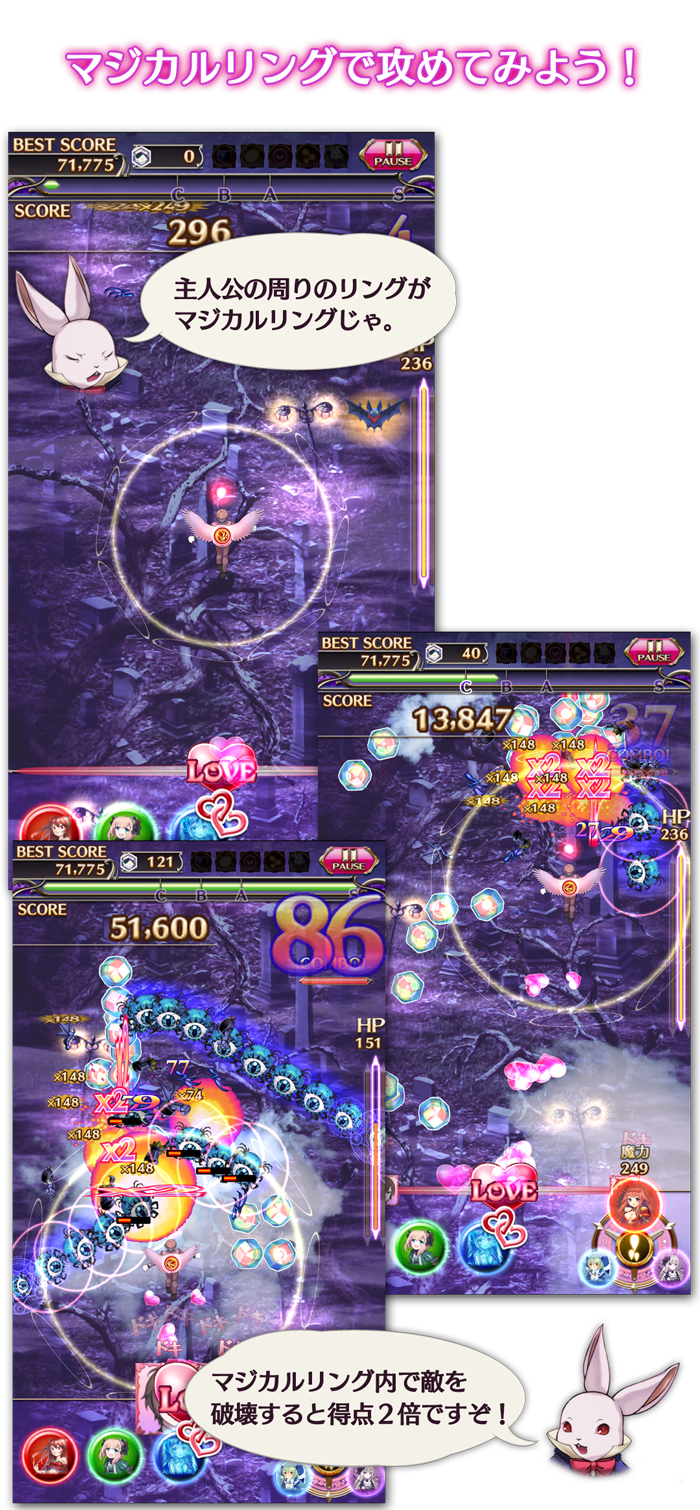 「ゴシックは魔法乙女」は、これまでのケイブタイトルとここが違う!ってところはどこですか?先の回答でも書きましたが、「基本プレイ無料」での本格的なシューティング、というところですね。 スマホでのゲームということで、現状のライフスタイルを考慮したゲーム性やバランス設計であったり、継続してプレイする上でのステージボリュームなども大きなポイントでした。また、今回はシューティングユーザー間の技術格差を埋めつつどのように同じ土俵で戦えるか?といったことにもチャレンジしています。