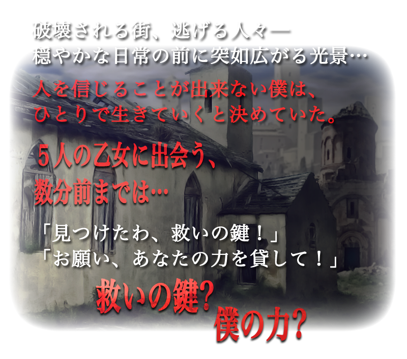 僕には、父の記憶も、母の記憶も、ない。 あるのは、人の心を読める不思議な力。 この力のために、僕は人とふれあうことを避け、いつしか心を閉ざしていた。 ただ、今わかっていることは、自分が乙女たちの求める「救いの鍵」なるものらしいということだけ。 戸惑いの中、このちょっと強引な乙女たちとの出会いが、再び自分と向き合うきっかけとなっていく…