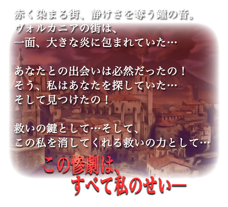 このヴォルカニアは、私の故郷。 そして、本当は私が守るべき大地だった。 けれど、あの日… 急に、私の中の赤い魔力が膨れ上がって、 抑えきれなくなった…の… 私の罪… 変えることのできない過去。 でも、あなたとの出会いが、 私の中にある抑えきれない大きな悲しみを、 静かに溶かしていくことになる…